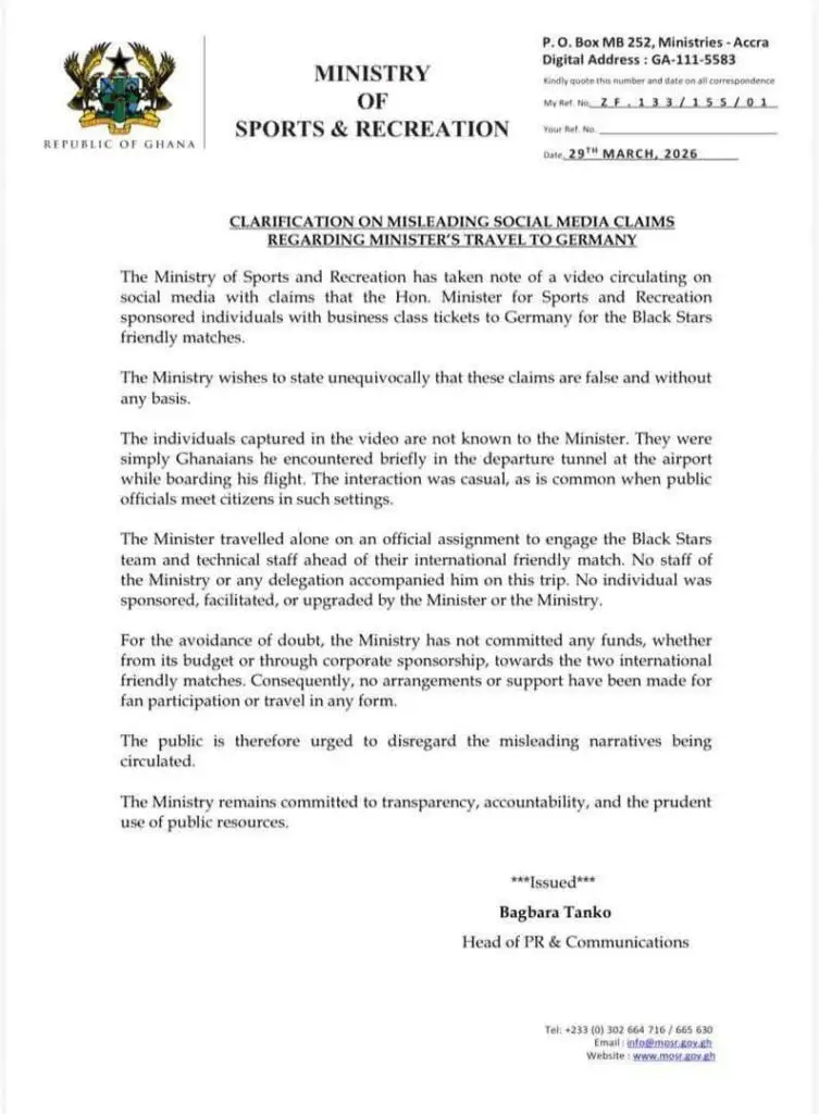 This clarification comes after social media reports circulated claiming that a group of Ghanaian supporters had been sponsored by the government to attend the Black Stars’ friendly against Germany. The Ministry insisted that these reports were inaccurate and urged the public and media outlets to verify information before dissemination.
